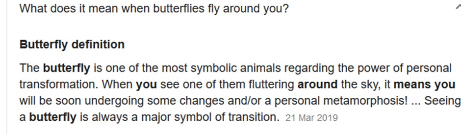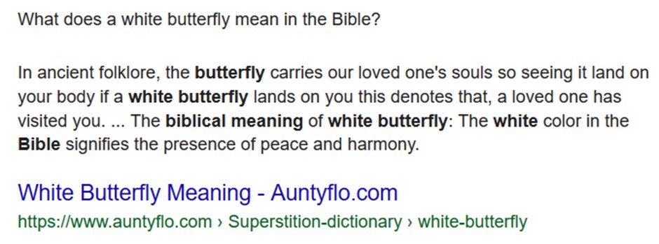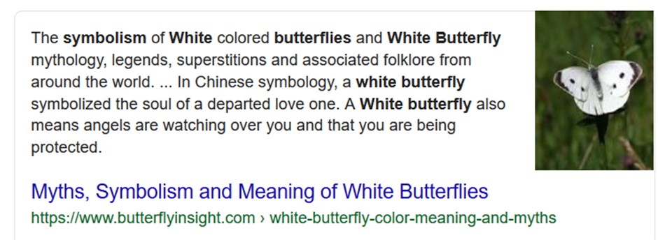 Another example, there was one day in particular that stands out. A big massive moth was flying on the front car passenger window. The window was closed and I was sitting in that seat, it really appeared as though the moth was trying to get in the car and on me. I was very glad the window was closed. Later that day a pure white cat crossed my path. It caught my attention as I don’t recall ever seeing one before. Then that night as I was walking home, a white butterfly flew by me. Again it caught my attention as it was dark and the butterfly was like a bright light. And again I don’t think I remember seeing a white butterfly before. I googled all these things and was amazed by what I found. Please see the examples below: