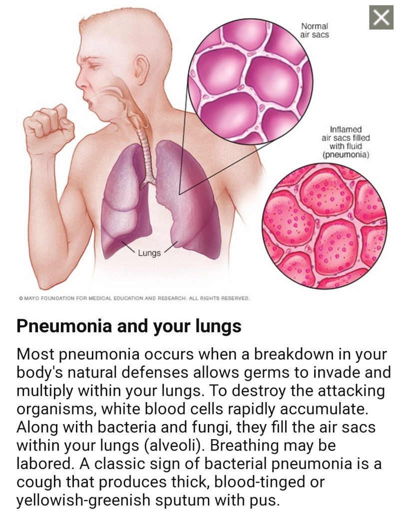 Pneumonia is an infection that inflames the air sacs in one or both lungs. The air sacs may fill with fluid or pus (purulent material), causing cough with phlegm or pus, fever, chills, and difficulty breathing. A variety of organisms, including bacteria, viruses and fungi, can cause pneumonia.