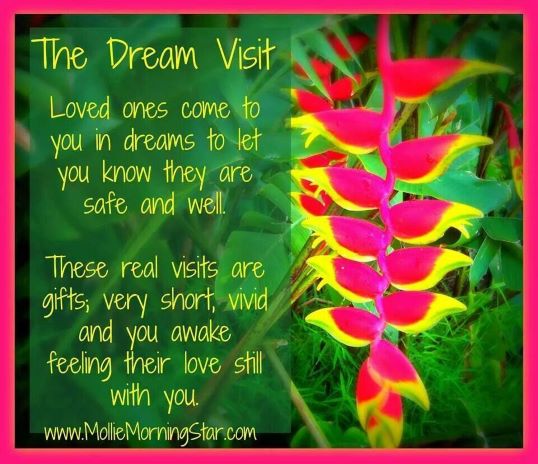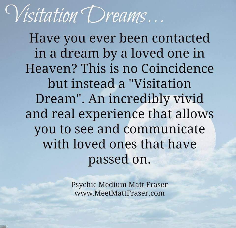 “Visitation dreams have been seen as a healthy part of the grieving process. The dreamer recalls the person who has passed, and for a brief time, is able to feel less pain and grief over their loss. It’s as though the presence of their friend or family member in a dream helps them feel like they didn’t really leave”.