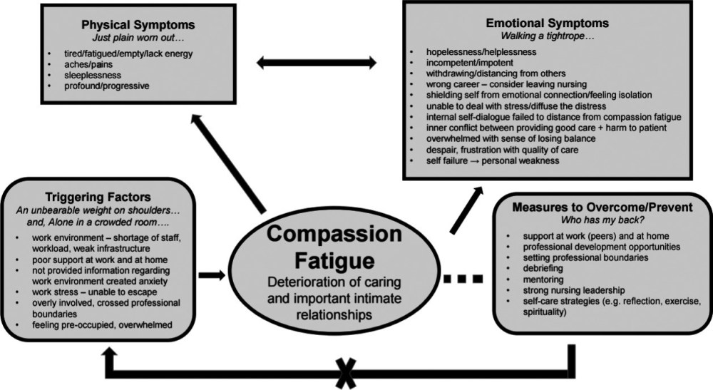 “Compassion Fatigue has been described as the “cost of caring” for others in emotional and physical pain. (Figley, 1982) It is characterized by deep physical and emotional exhaustion and a pronounced change in the helper’s ability to feel empathy for their patients, their loved ones and their co-workers”.