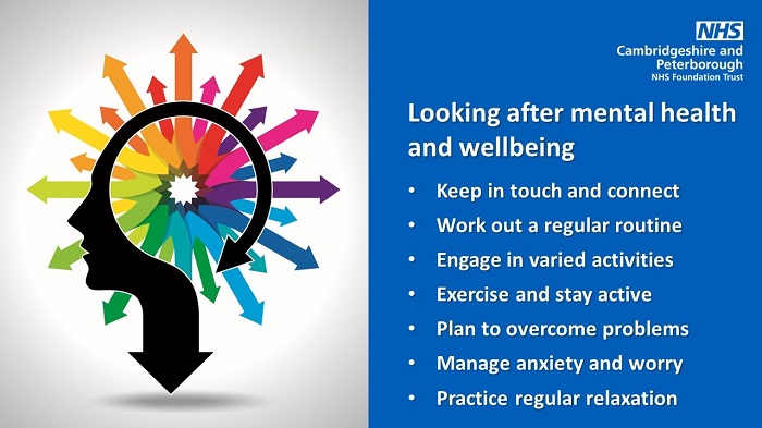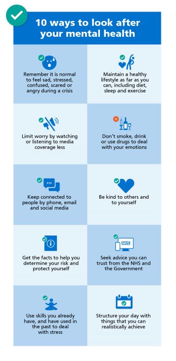“Find information and tips for managing your mental health and wellbeing while social distancing or self-isolating during the coronavirus outbreak”.