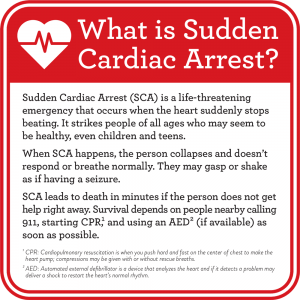 “October is Sudden Cardiac Arrest Awareness Month. According to the Heart Rhythm Society, more than 350,000 deaths occur each year from Sudden Cardiac Arrest” (SCA). (21 Oct 2019).