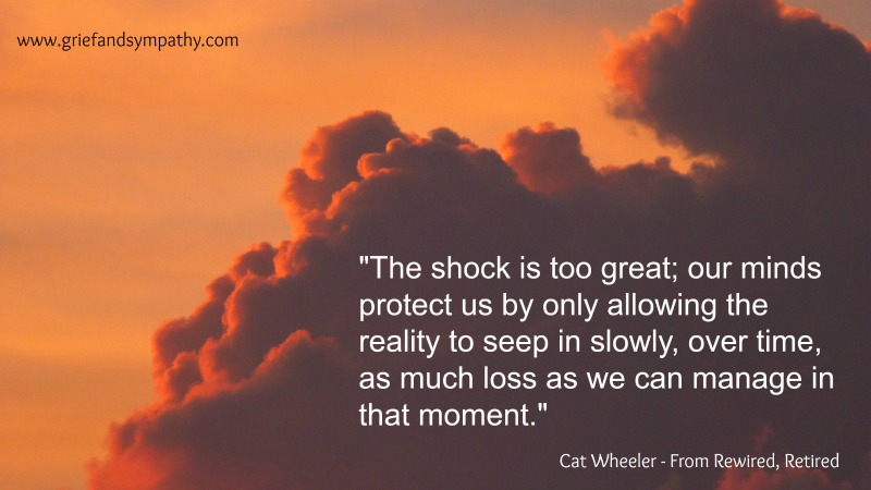 “When fully immersed in the grieving process, you then may feel flooded with tears and emotions. … Recognize that shock is a natural part of grief that may occur many times before the actuality of the loss sinks in. Even though it feels off-balance, it is part of the process of dealing with painful experiences”.