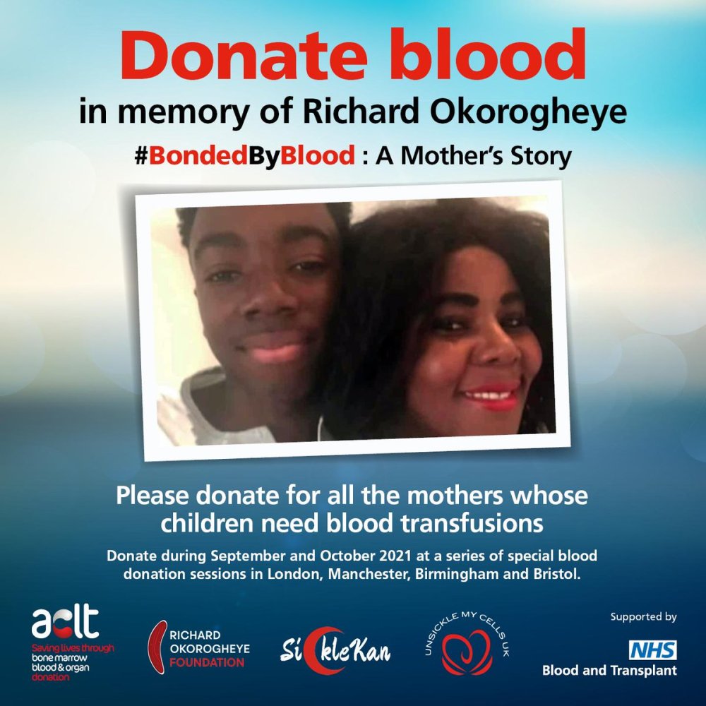 “Four black health charities and individuals launch the ‘Bonded By Blood’ campaign including the Richard Okorogheye Foundation, blood cancer charity ACLT (African Caribbean Leukaemia Trust), community organisations Unsickle My Cells (CIC) and SickleKan. Mothers are appealing for more Black donors to help people with sickle cell, like Richard”.
