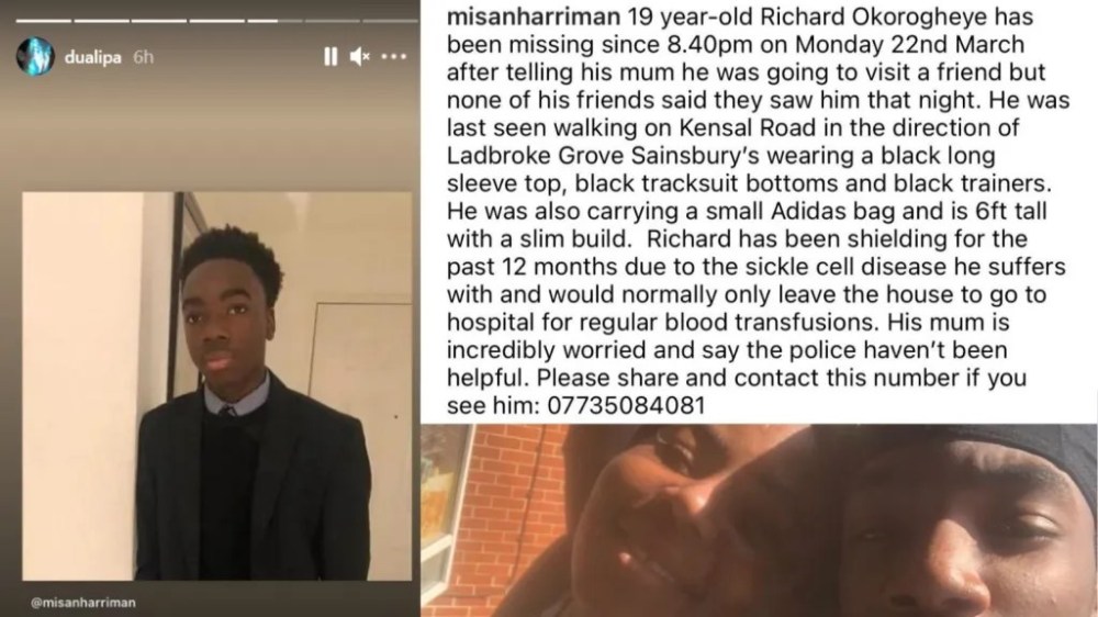 “Okorogheye, 19, has not been seen since leaving the home he shared with his mother, Evidence Joel, in Ladbroke Grove, west London, on the evening of 22 March 2021”.