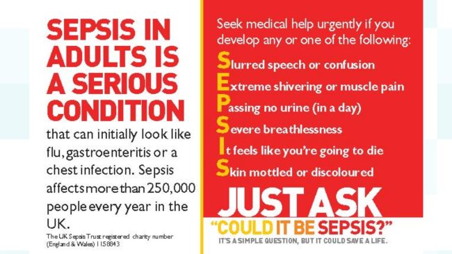 “Sepsis is a life-threatening reaction to an infection. It happens when your immune system overreacts to an infection and starts to damage your body’s own tissues and organs. You cannot catch sepsis from another person. Sepsis is sometimes called septicaemia or blood poisoning”.