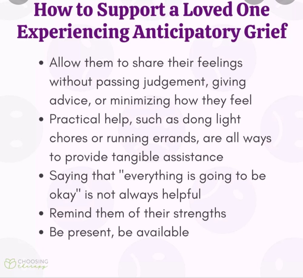 “If you are facing the end of your life or the death of someone close, grief may come before death does. Anticipatory grief refers to the sorrow and other feelings you experience as you await an impending loss”. (5 Nov 2021).