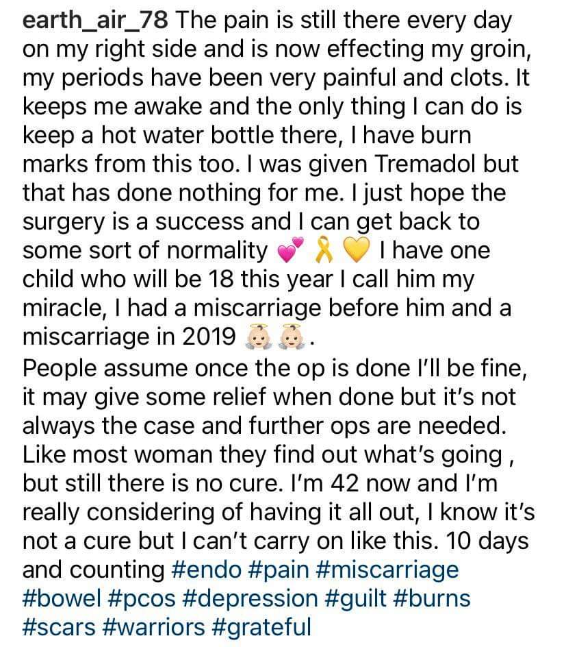 Skip a few more years in 2019 my partner and I became pregnant only for me to miscarry. Oct 2020 I had severe abdominal pain and throwing up it wasn’t my period as I’d just finished it, I spent 4 days in hospital having scan after scan blood tests, only for me to be discharged and having to wait to see a gynaecologist who specialises in endo. I was given so much pain medication I ended up with gout in my foot so I couldn’t walk.
