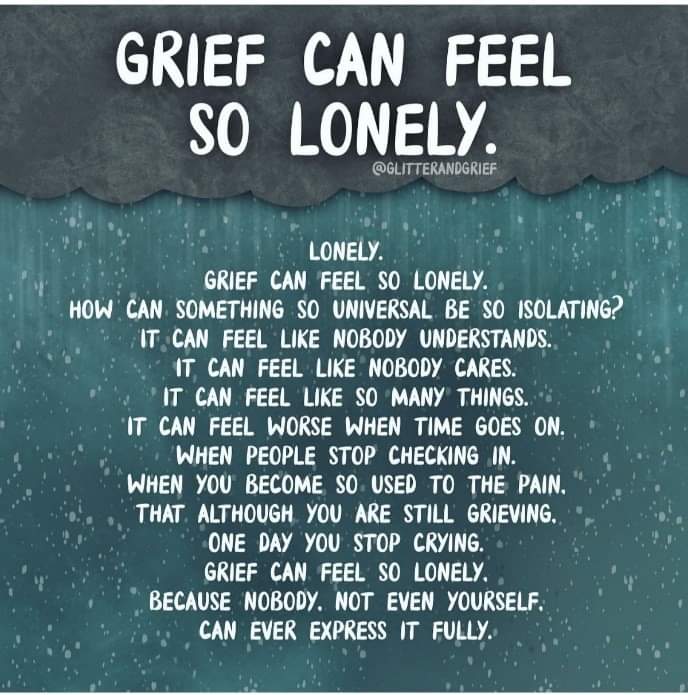 “That loneliness and related feelings of isolation are normal. These two sensations are also normal and natural feelings associated with grief. Grief can be a very lonely and isolating experience. No matter the loss that is causing your emotional pain, you are very much alone in how it impacts you”. (10 Aug 2017).
