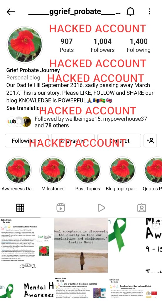 On Friday night (13th May 2022) our official Grief Probate Journey Instagram account was hacked. We fell into a trap of responding to a message sent to us by who we thought was one of our friends in our grief community. Because we thought it was them we were interacting with them. By the time we realised something was wrong it was too late. We have contacted the person to let them know we were hacked and that they have also been hacked. We provided them with the link to their hacked account.
