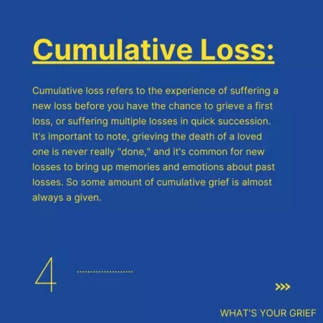 “Cumulative Grief may occur when an individual, experiences multiple losses either all at once or before processing an earlier loss”.